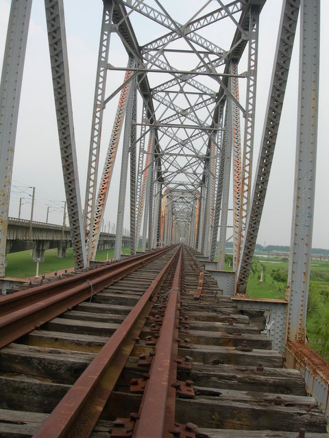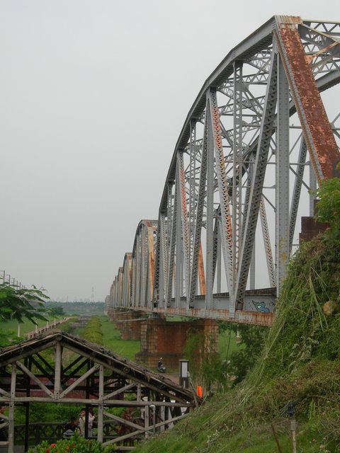 右邊是現在的鐵道,左邊當然是造型十足的舊鐵橋囉!如果可以把車合成上去吧!哈