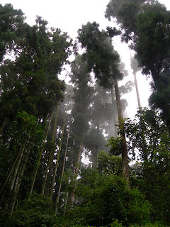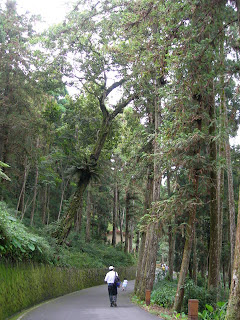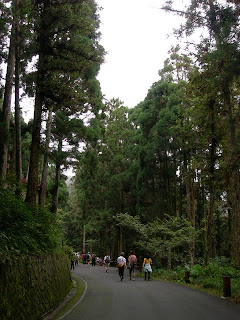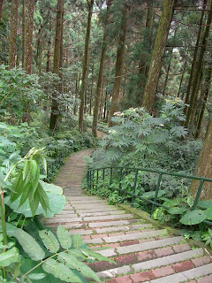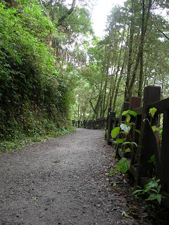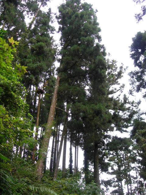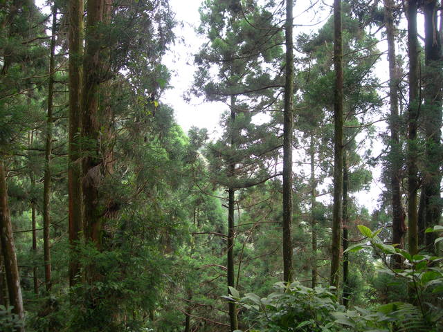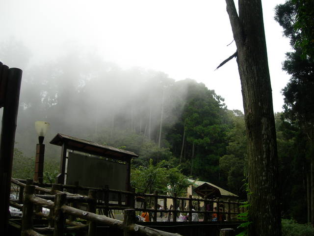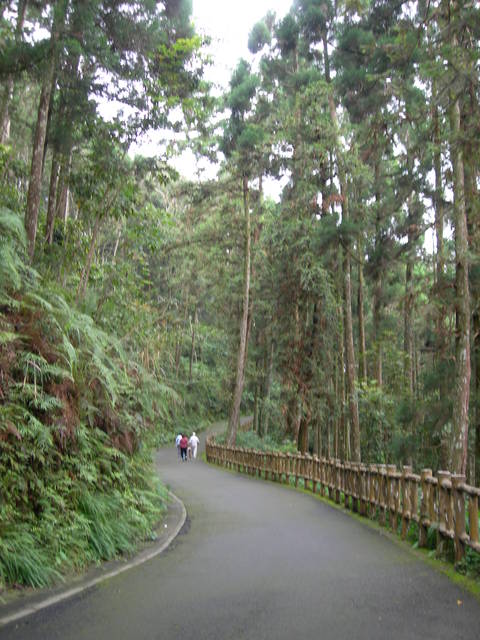 映入眼廉的是步道、山坡、筆直的樹!還有霧霧的背景