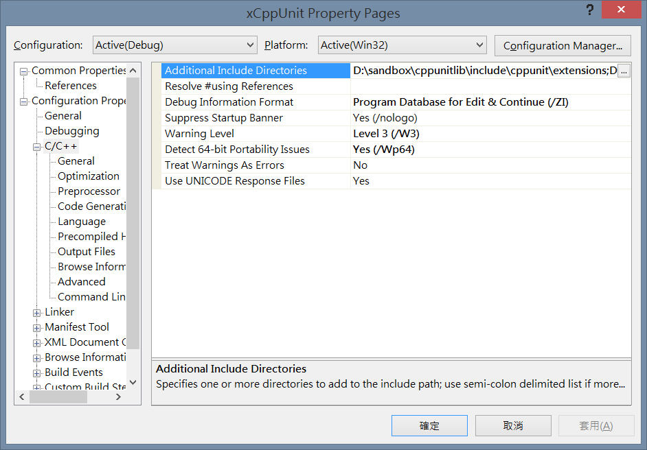 要知道我們在上一篇編譯結束後,出現的cppunit.lib 和 cppunit_dll.lib要如何正確使用。除了擁有link時期需要的.lib檔之外,還要取得complier時期需要的.h檔(也就是include會用到的部份)。