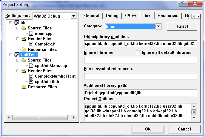 在Object/library modules: 中填入.lib檔的檔名 在Additional library path: 中填入.lib檔放置的路徑 |