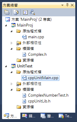 一樣UnitTest是獨立在開發專案外的另一個專案。(此專案是由空專案開始,加上.cpp和.h)