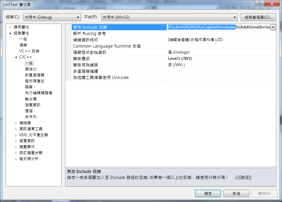 最後,設定專案檔,如何使用CppUnit的檔案。因為與VC6的介面大不同,而且從VS2003(有這一版嗎?)之後幾乎就是長這樣(只有些許的不同),在此講一下,適用滿多版本的。
