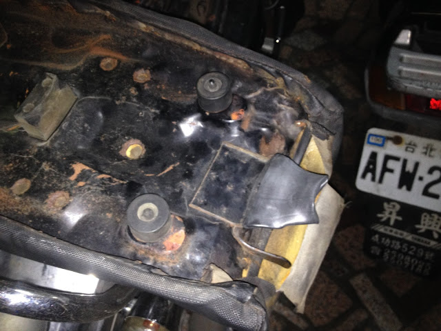 座墊卡油箱的那一部份,除了如圖的那裡已用內胎取代(因為也買不到了)之外,兩邊的金屬,也用內胎圈起來(像橡皮筋這樣轉兩圈)確保座墊不會再和油箱打架。